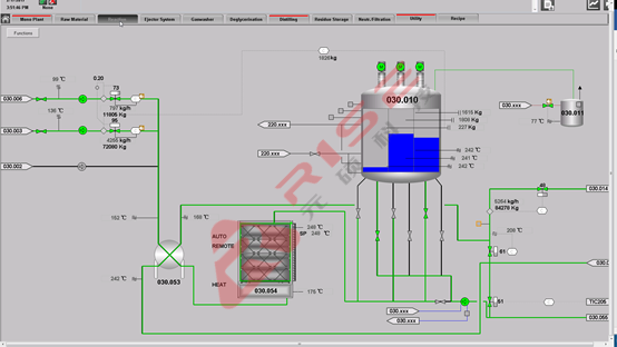 自动化监控系统主要包括:蒸馏系统、气体洗涤系统、喷雾系统、反应系统、原料处理系统等及其它配套辅助系统。需要对这些系统进行数据实时采集和处理,数据显示和历史记录, 在此平台上,完成生产过程系统的远程集中监控,通过数据分析、数据整合,数据进入统一的工业历史数据库,保证数据与管理决策信息系统无缝的连接,提供统一的数据发布平台,提供统一的生产过程数据与管理数据的数据集成平台,保证整个综合自动化系统数据的有效性、一致性; 另外不同业务和系统间也能够实时进行数据交换和共享。监控画面如下: