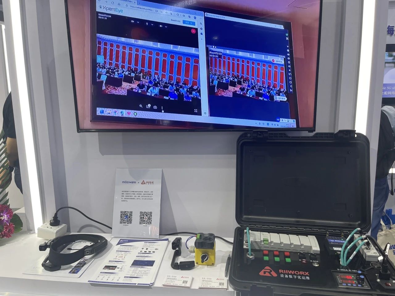 在本届工博会上,元硕科技的展位以RIIFix为切入点,展示了结合工业穿戴设备的设备数字化运维解决方案,涵盖了制造设备状态监测、故障预警、远程维护等多个方面。