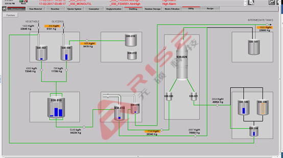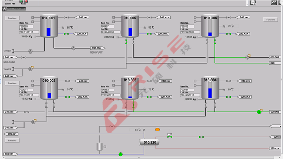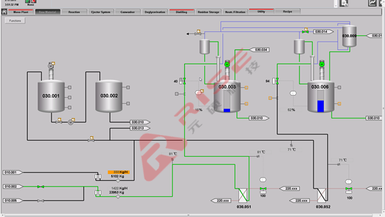 自动化监控系统主要包括:蒸馏系统、气体洗涤系统、喷雾系统、反应系统、原料处理系统等及其它配套辅助系统。需要对这些系统进行数据实时采集和处理,数据显示和历史记录, 在此平台上,完成生产过程系统的远程集中监控,通过数据分析、数据整合,数据进入统一的工业历史数据库,保证数据与管理决策信息系统无缝的连接,提供统一的数据发布平台,提供统一的生产过程数据与管理数据的数据集成平台,保证整个综合自动化系统数据的有效性、一致性; 另外不同业务和系统间也能够实时进行数据交换和共享。监控画面如下: