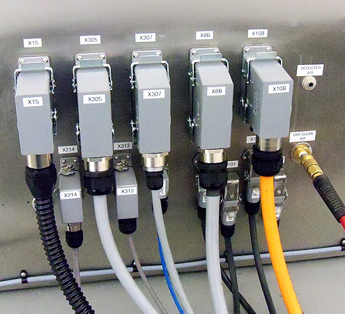 - 压片机后面板的新连接器井井有条,标记清晰。